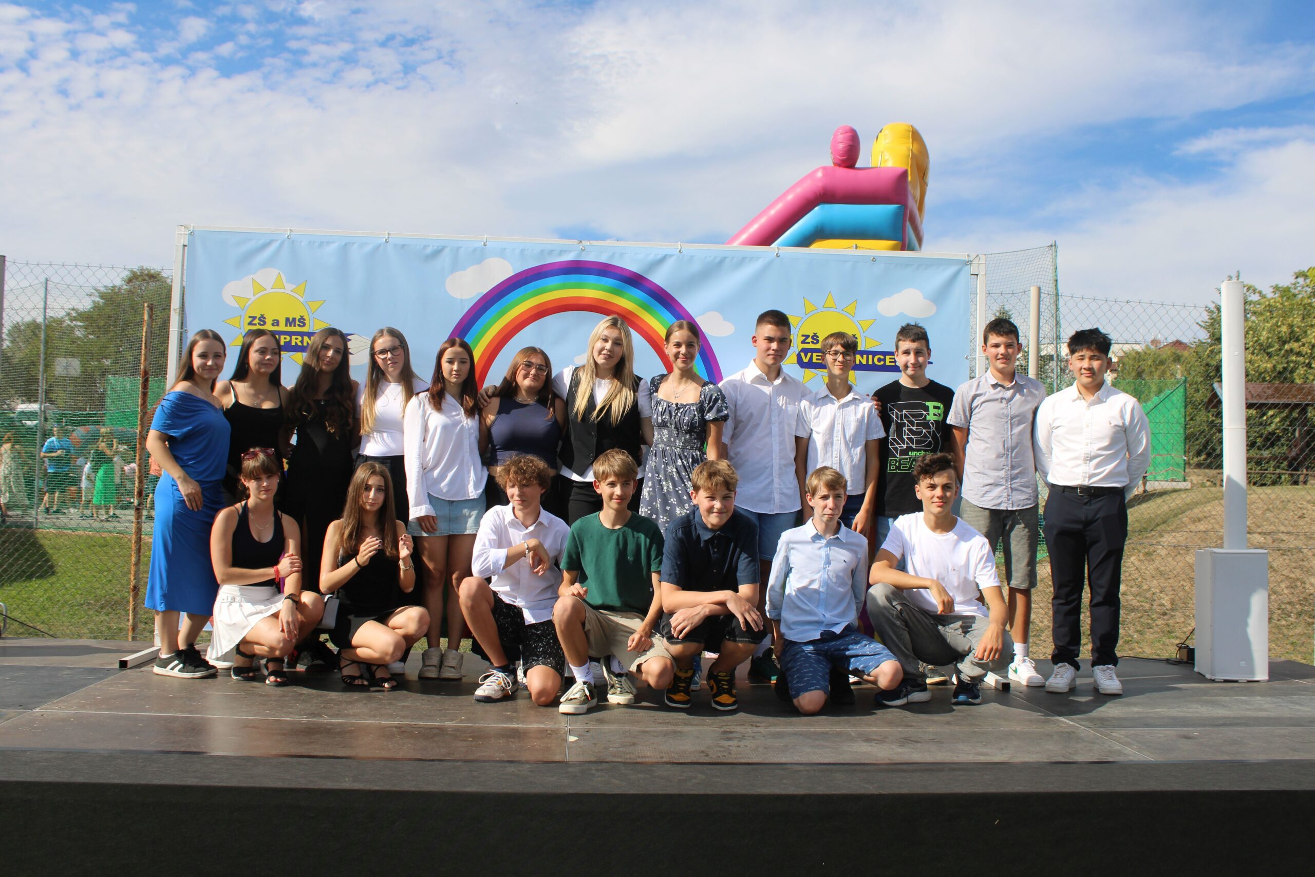 Ředitelka školy ve svém úvodním projevu srdečně přivítala všechny přítomné – žáky, rodiče, zaměstnance školy i hosty. Zvláštní pozornost byla věnována našim nejmladším – prvňáčkům, které tradičně přivítali jejich starší spolužáci z devátého ročníku. Každý prvňáček od nich obdržel památeční medaili jako symbol vstupu do nové životní etapy.